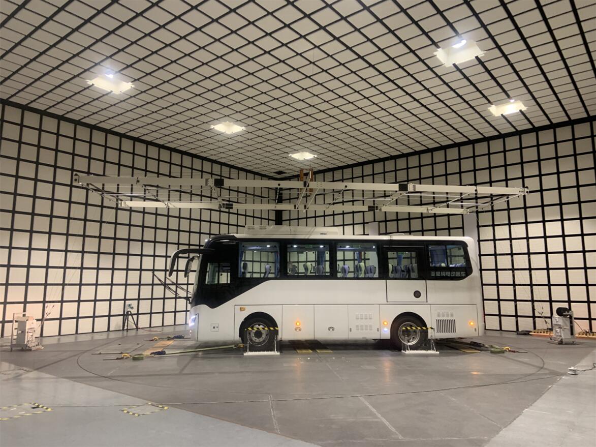 整车低频带状线天线可覆盖频率范围为10kHz~30MHz,安装调试完成后招商车研10米法电磁兼容试验室的整车抗干扰测试系统可覆盖频段范围为10kHz~6GHz,电场强度可达到200V/m,在雷达波频段其电场强度可达到600V/m,可满足ISO11451-2、GB/T33012.2、国内外企业标准,为乘用车和商用车企业提供研发性委托检测业务。
