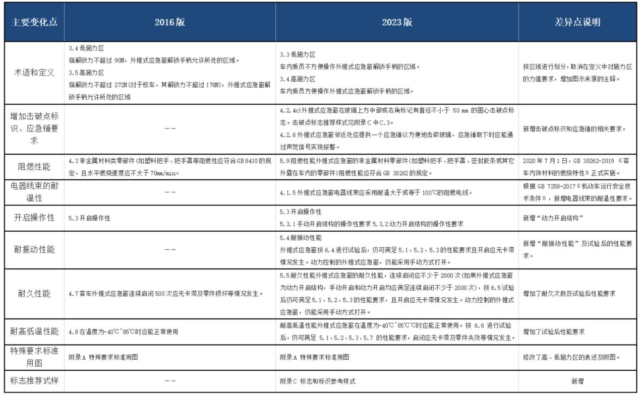 新标准QC/T 1030-2023《客车外推式应急窗》相较于QC/T 1030-2016老标准主要新增了击破点标识、电器线束的耐温性、耐振动性能和标志标识等技术要求,相关修订内容详见下表: