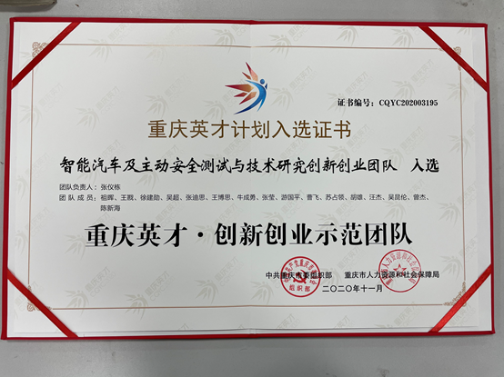 近日, 2020年度重庆英才计划入选名单揭晓,重庆车检院“智能汽车及主动安全测试与技术研究创新创业团队”从众多候选者中脱颖而出,顺利入选重庆英才计划-创新创业示范团队,获得重庆英才计划入选证书(编号CQYC202003195)。